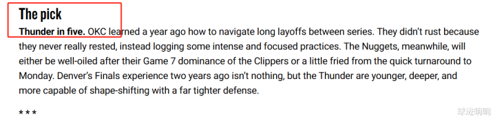 面对这一轮MVP大战,NBA官方网站迅速发文做出预测,认为雷霆队将通过5场比赛淘汰掘金晋级。